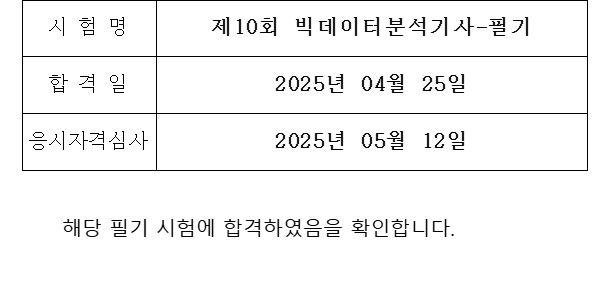 단순한 개념 암기형 시험이 아니라 실제 데이터를 다루고 문제를 해결하는 능력이 요구되기 때문에, 데이터 기반 사고력과 실전 감각을 함께 키울 수 있는 기회라고 판단하여 도전하게 되었습니다.
