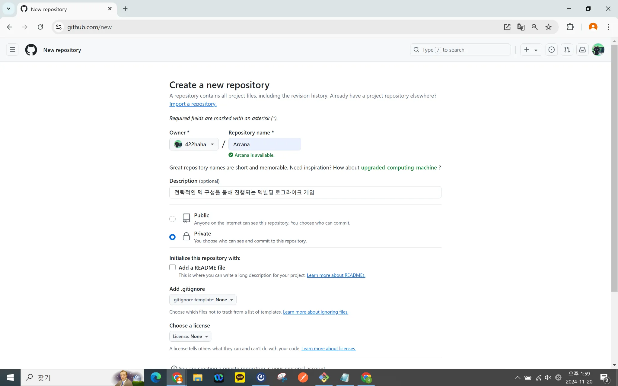 - Privacy: Private을 선택하여 비공개 리포지토리를 생성합니다.