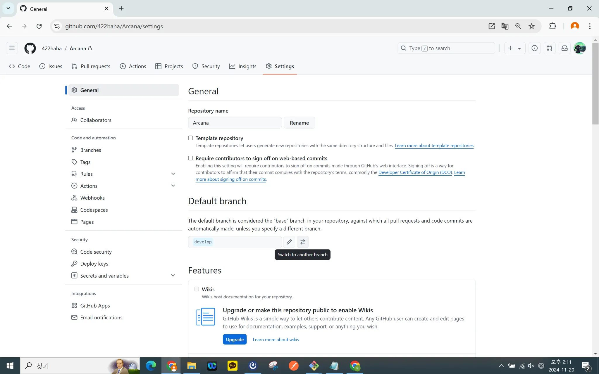 - Change default branch: 기본 브랜치를 변경할 수 있는 옵션입니다.
